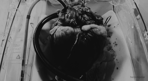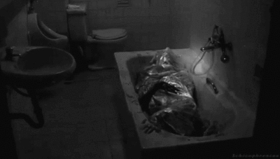 There is something written on the walls:"Rosalind and Samuel, rotting in the trash"There is a body bag in the tub, moving.